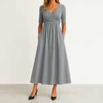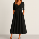 Chic, confortable et flatteuse, la Robe Midi à Col V sublime la silhouette au quotidien. Son décolleté croisé met en valeur le buste, la taille empire drapée affine visuellement, tandis que la jupe évasée offre un tombé fluide. Les manches mi-longues apportent une touche raffinée et les poches latérales rendent la robe aussi pratique que stylée. Portez-la avec des escarpins pour une allure sophistiquée ou des sandales pour un look décontracté.